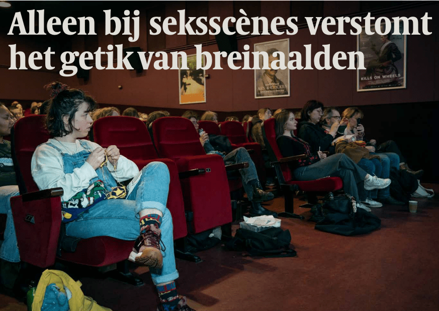 Zoals altijd dimmen de lichten in de bioscoop, maar daar is een van de bezoekers van uitverkochte zaal het niet mee eens. Het Kijkhuis is deze zaterdagochtend om half elf volgestroomd met vrouwen die namelijk niet alleen komen om film te kijken maar ook om truien, topjes en sjaals te breien.